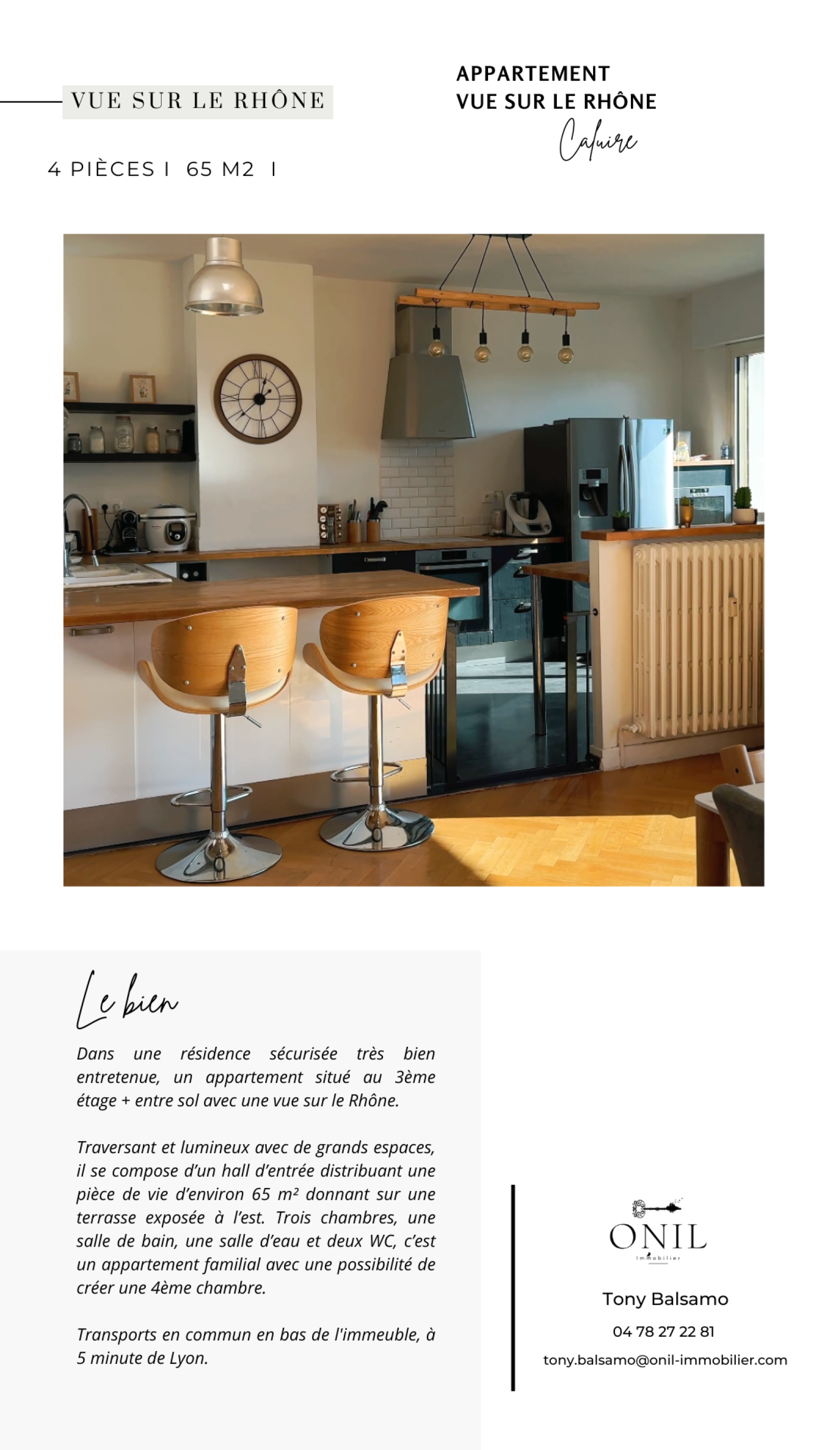 Dans une résidence sécurisée très bien entretenue, un appartement situé au 3ème étage + entre sol avec une vue sur le Rhône. Traversant et lumineux avec de grands espaces. Il se compose d’un hall d’entrée distribuant une pièce de vie d’environ 65 m2 donnant sur une terrasse de 8m2 exposée à l’est. Trois chambres, une salle de bain, une salle d’eau et deux WC, c’est un appartement familial qui peux avoir 4 chambres.