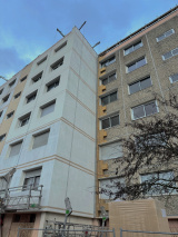 Rénovation de la façade avec isolation thermique en cours de travaux.